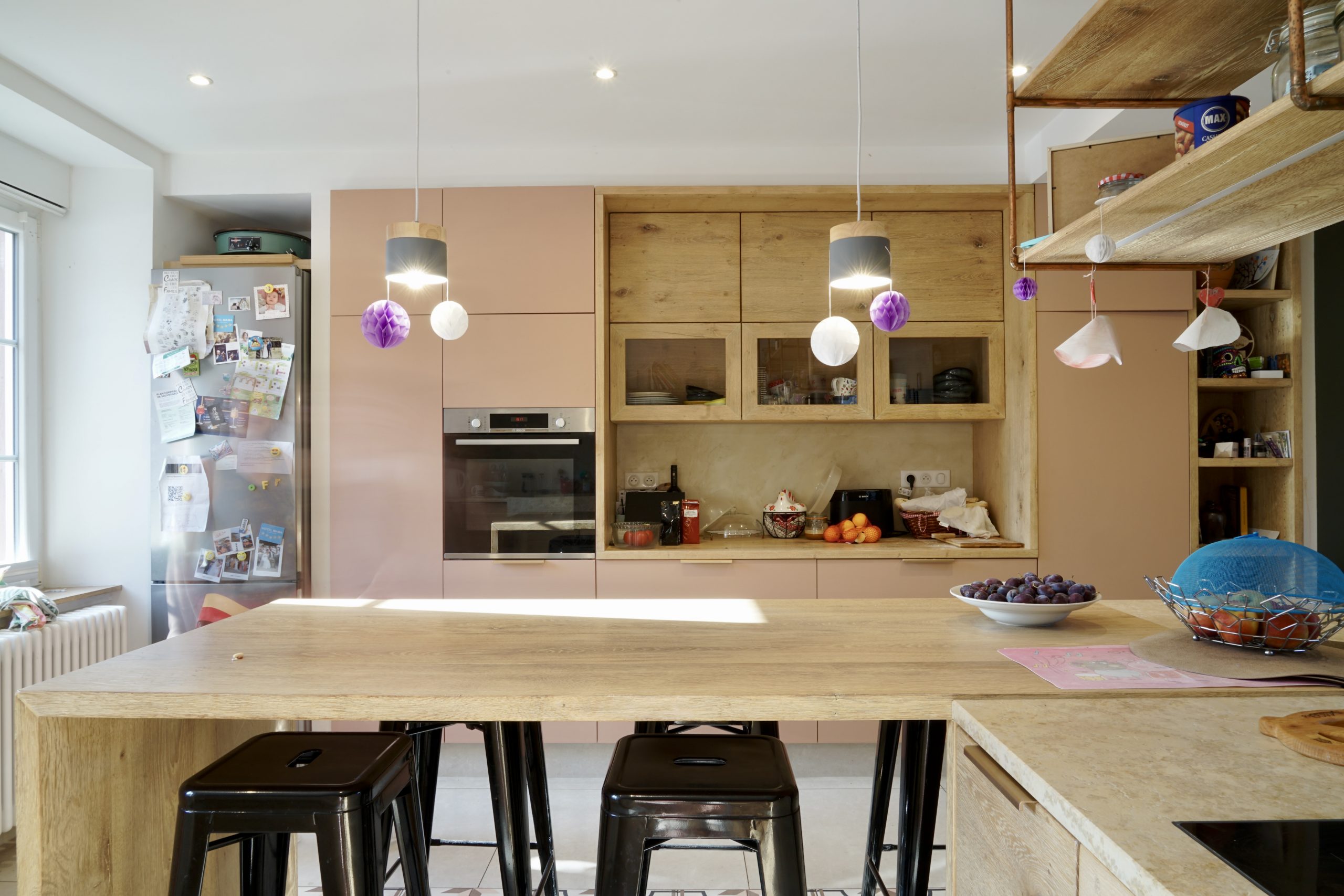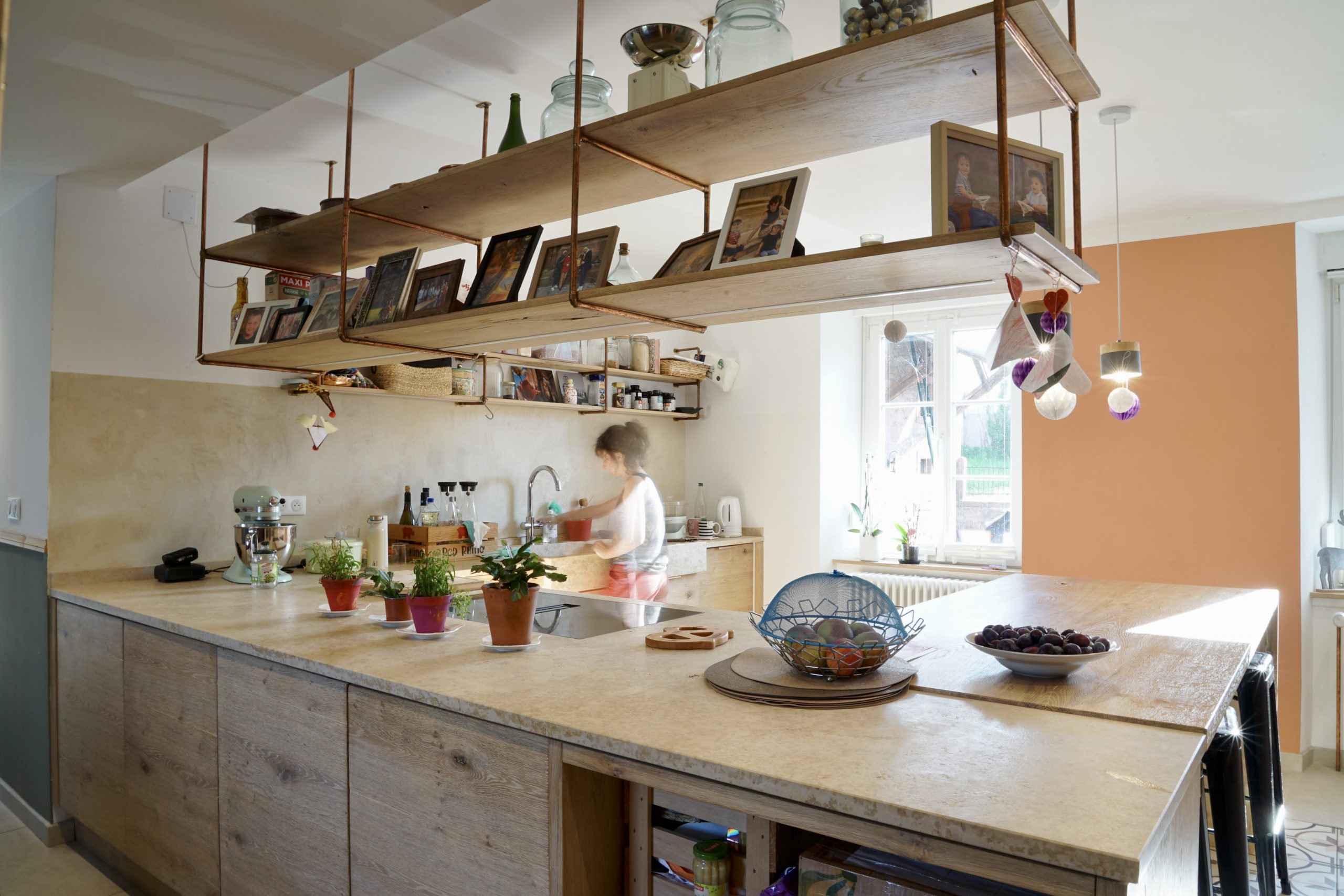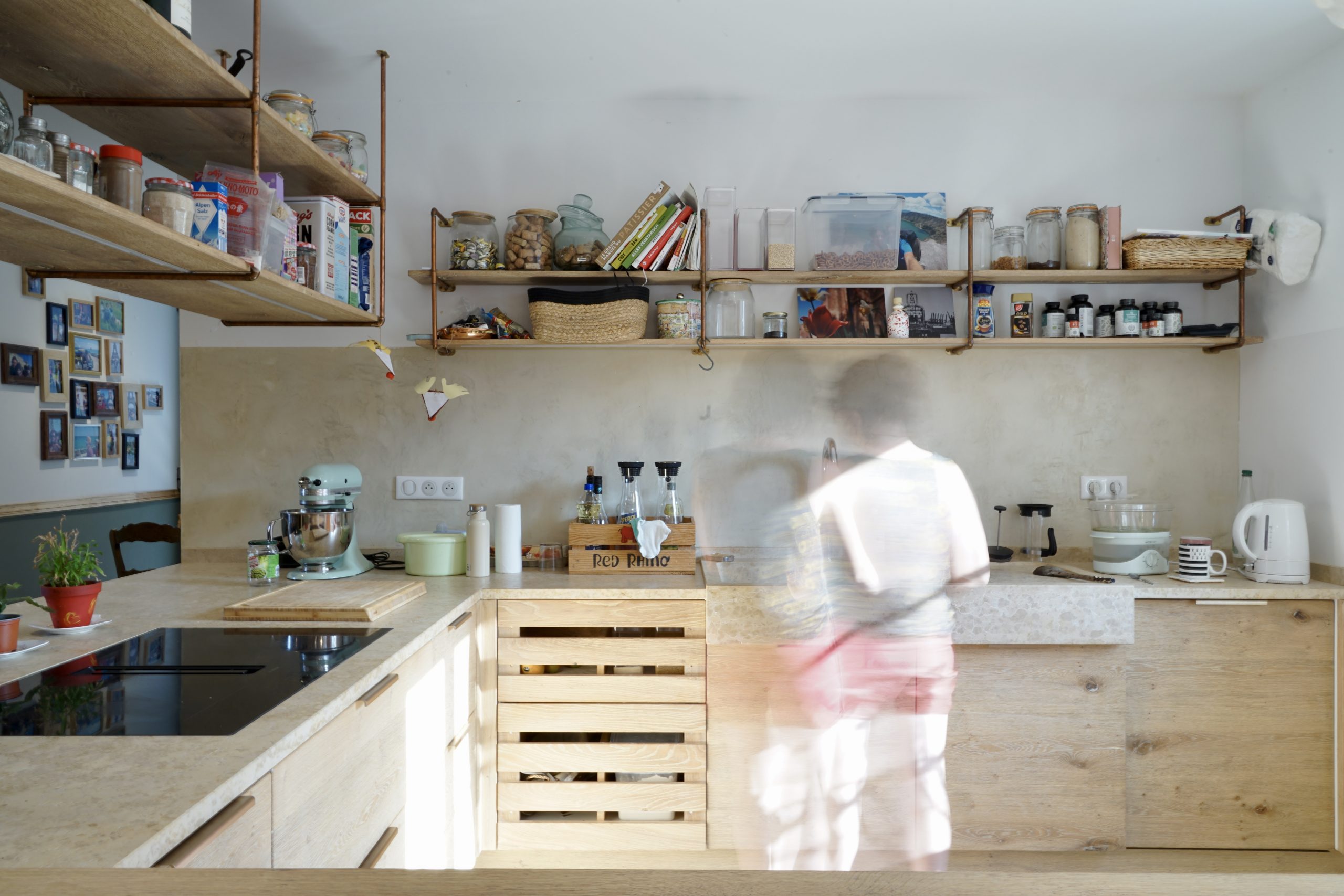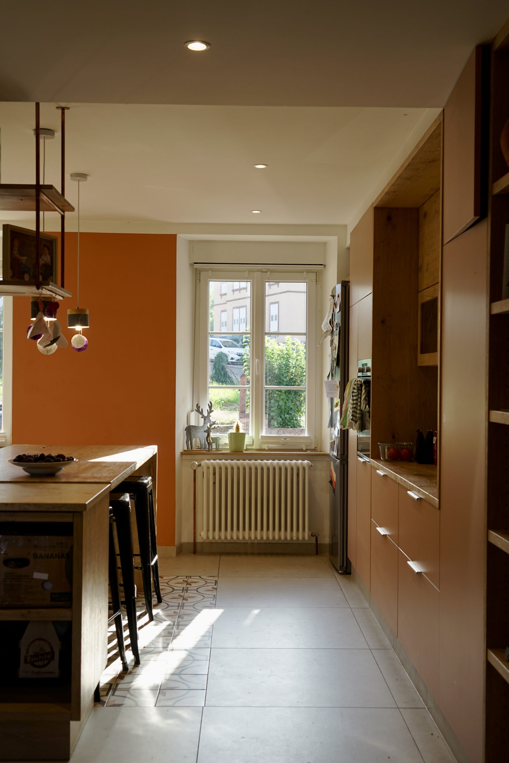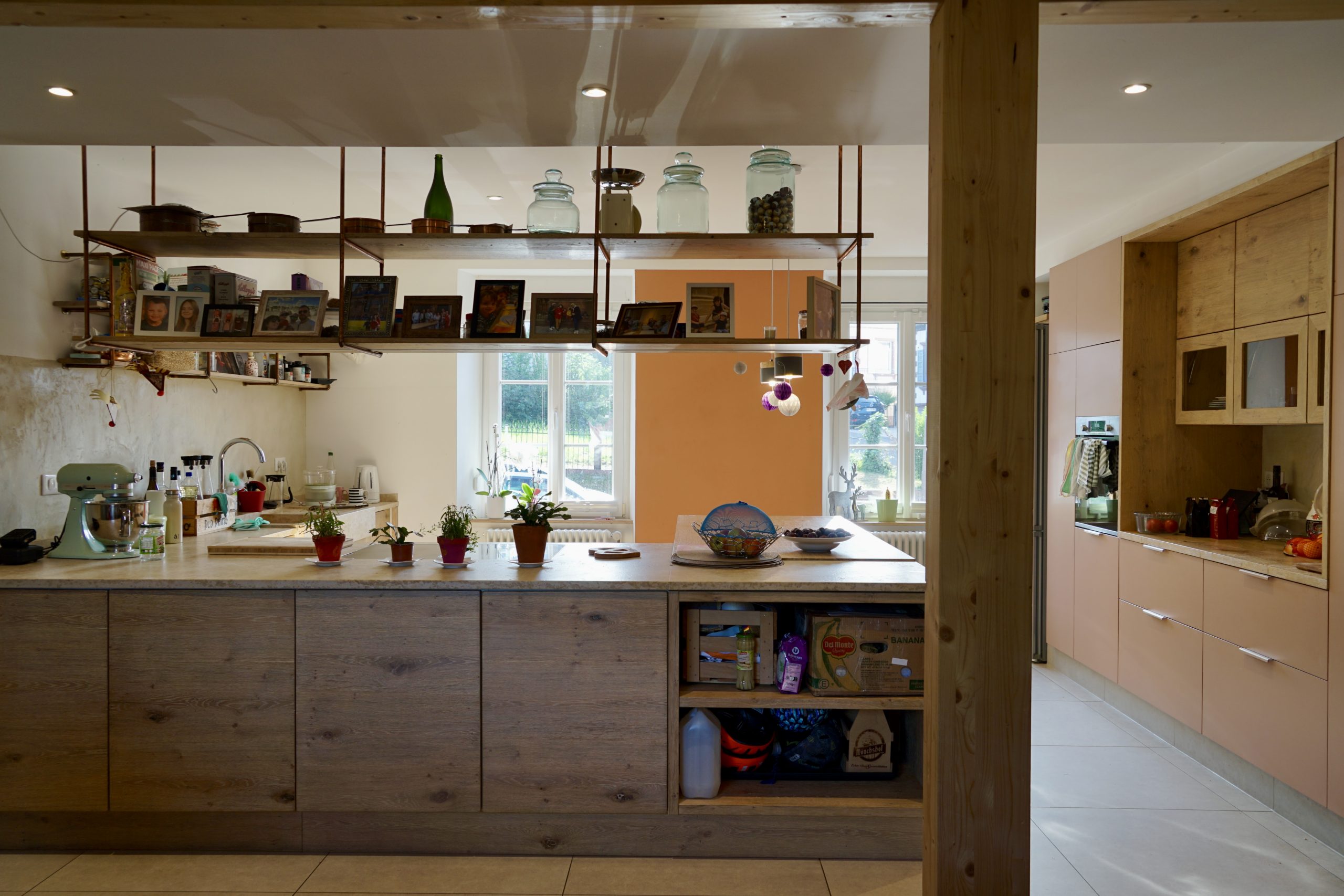 Il s’agit ici d’agrandir la cuisine de la maison d’habitation d’un jeune couple avec deux enfants. La cuisine jugée trop étroite en terme de rangement et surface est vouée à devenir une vraie pièce de vie chaleureuse, conviviale et fonctionnelle. Le projet prévoit également l’aménagement d’un espace séjour devant pouvoir accueillir une douzaine de convives. Les habitants ont opté pour une cuisine sur mesure largement ouverte sur l’espace du séjour. Un des murs accueille des éléments mobiliers sur toute sa hauteur offrant de nombreuses possibilités de rangements. Les autres équipements s’organisent selon un plan en « L » dont le retour fait face à la grande table du séjour. L’étagère suspendue – offrant des solutions de rangements plus atypiques – souligne la séparation entre les deux espaces cuisine – séjour.